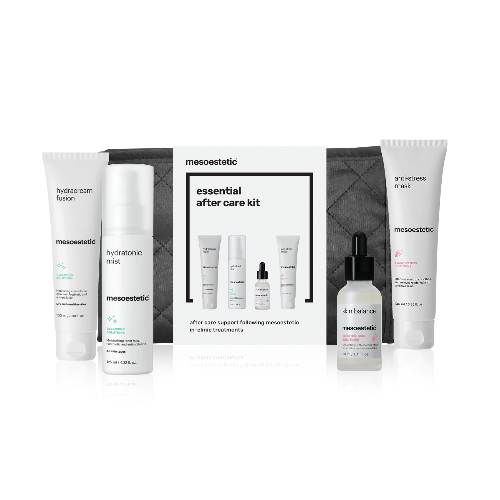 Mesoestetic Essential After Care Kit – a complete four-step recovery routine to calm, hydrate, and restore post-treatment skin.