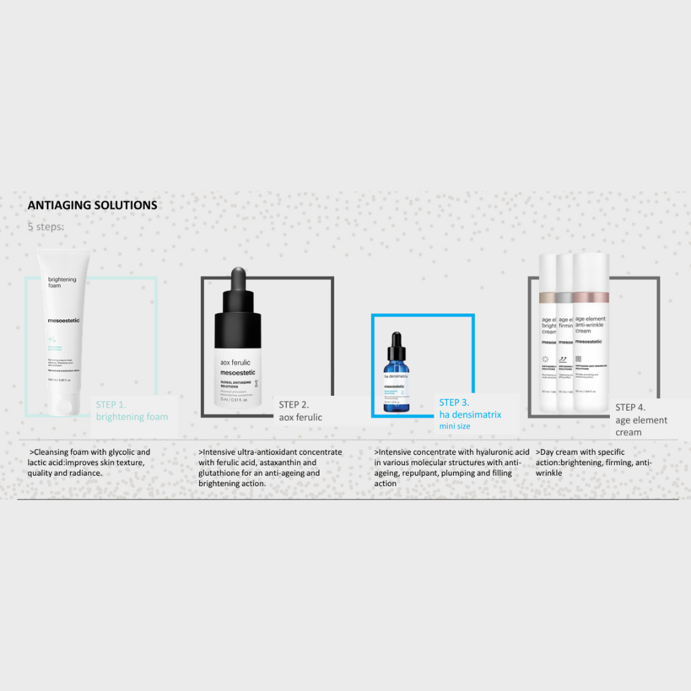 • minisize ha densimatrix: hyaluronic acid serum or concentrate that provides a moisturising, anti-ageing, repulping and filling action. It helps to promote hydration and supple skin, prevent dehydration and protect against premature ageing. 5 ml.