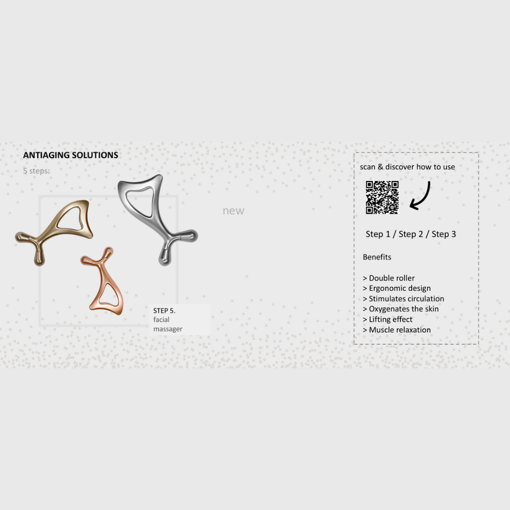 • Dual facial massager roller: it promotes the absorption of active ingredients, activates microcirculation and has a toning, firming and revitalising effect.
