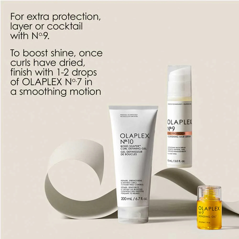 Olaplex No.10 Bond Shaper is a curl-enhancing styling gel that strengthens, defines and smooths curls without crunch. Formulated with OLAPLEX Bond Building Technology™, it repairs disulfide bonds at the molecular level to support curl structure while delivering medium hold and optimal slip for easy styling.